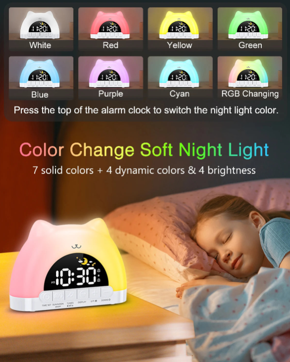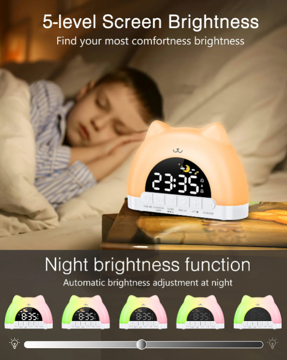 Pensé pour les petites mains, DouxMatin™ est simple, sûr et durable. Son contrôle tactile intuitif, son verrouillage enfant et son branchement Type-C en font un allié pratique et moderne. Sa batterie de secours conserve l’heure, et son design de petit chat lumineux en fait un compagnon adorable de la chambre.